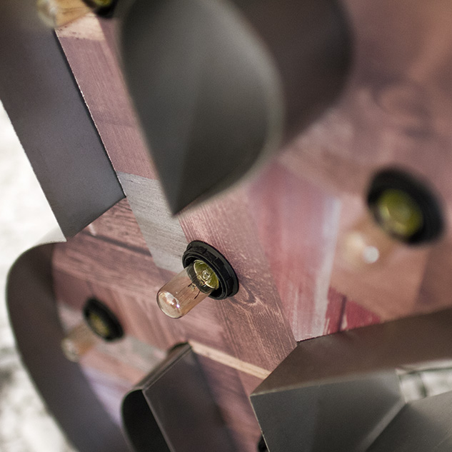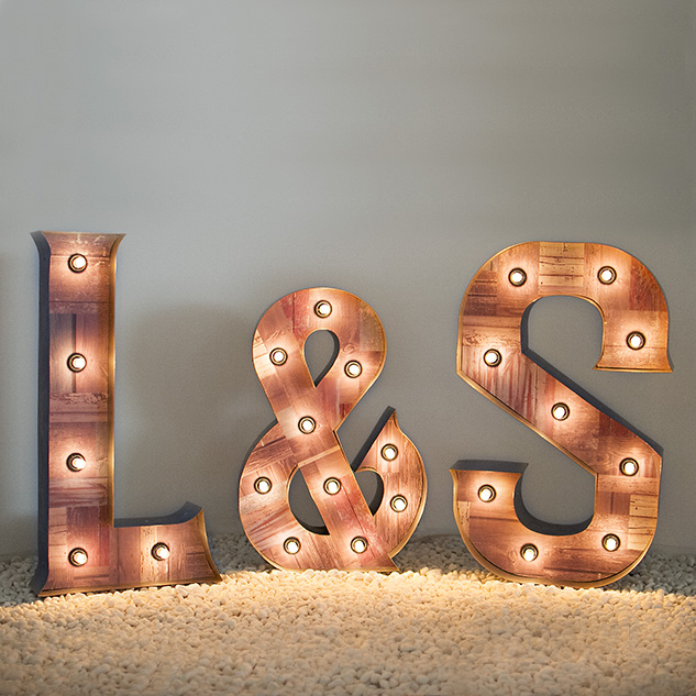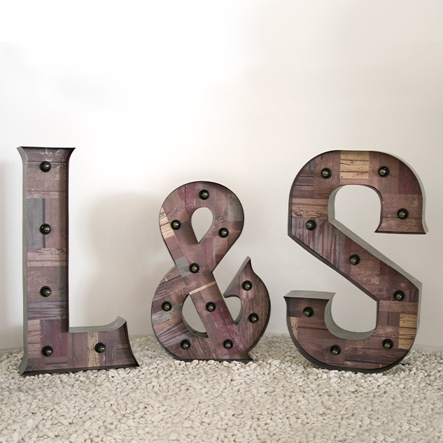 Letras de metal y madera, iluminadas con bombillas de luz cálida, todas ellas llevan circuito eléctrico oculto.
