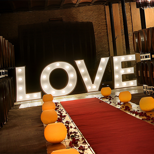 Las letras LOVE van iluminadas con bombillas, incluyen circuito eléctrico oculto y disponen de conexión eléctrica con regulador de intensidad.