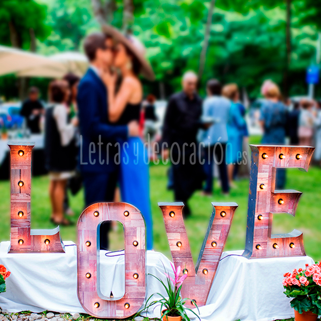 Letras de metal y madera, iluminadas con bombillas de luz cálida, todas ellas llevan circuito eléctrico oculto.