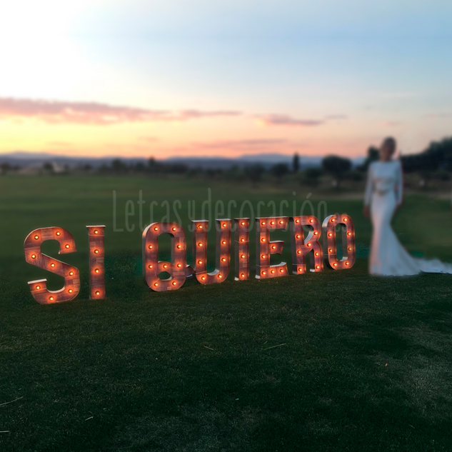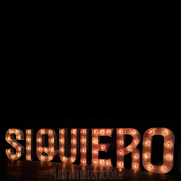 Letras de metal y madera, iluminadas con bombillas de luz cálida, todas ellas llevan circuito eléctrico oculto.