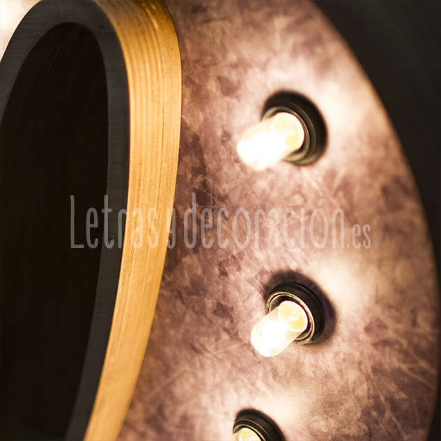 Están fabricados con tipografía unida, en madera envejecida y barnizada y con frontal de textura abstracta en lilas. La iluminación es con bombillas y llevan circuito eléctrico oculto.