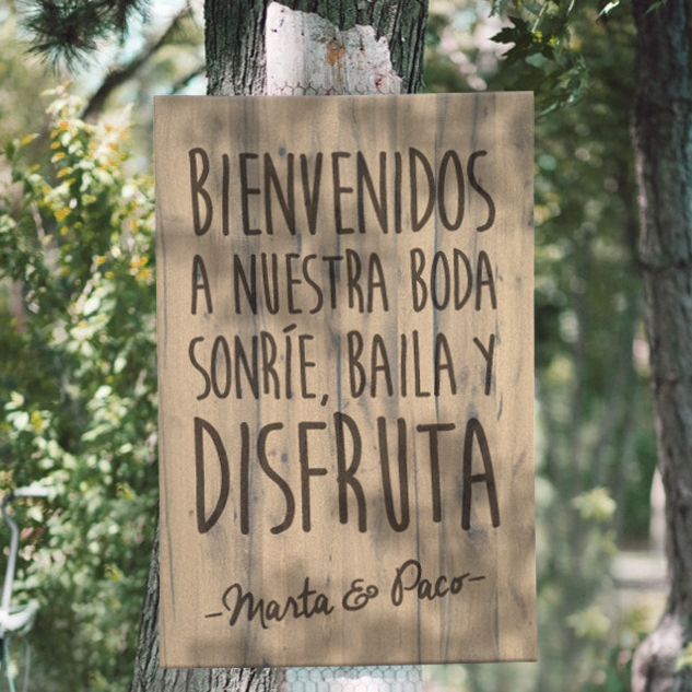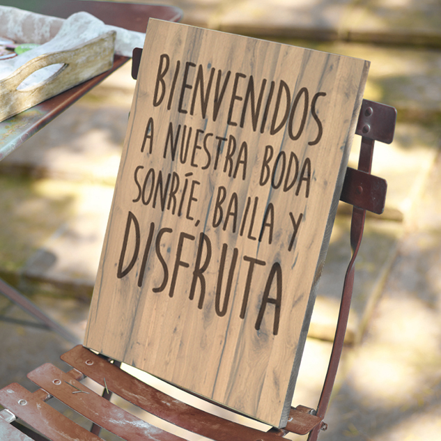 Cartel de madera natural "Bienvenidos a nuestra boda, sonríe, baila y disfruta", efecto vintage con impresión directa, ideal para decorar la entrada de tu ceremonia y dar la bienvenida a tus invitados.