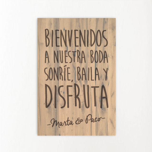 Cartel de madera natural "Bienvenidos a nuestra boda, sonríe, baila y disfruta", efecto vintage con impresión directa, ideal para decorar la entrada de tu ceremonia y dar la bienvenida a tus invitados.
