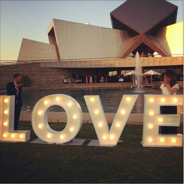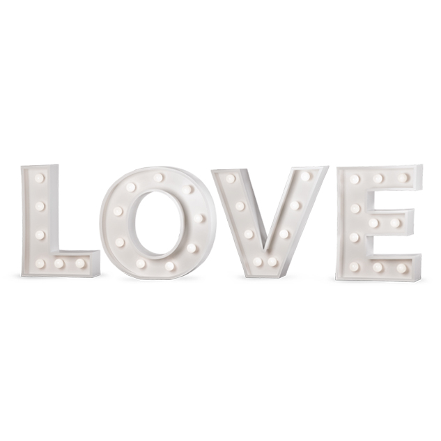 Las letras LOVE van iluminadas con bombillas, incluyen circuito eléctrico oculto y disponen de conexión eléctrica con regulador de intensidad.