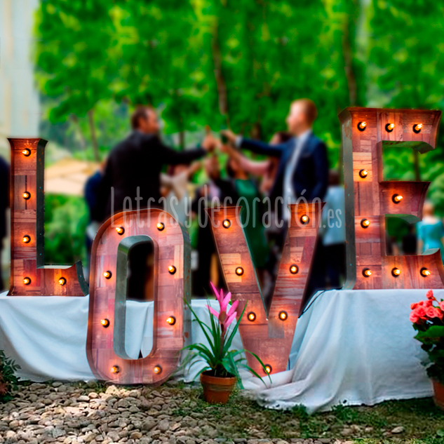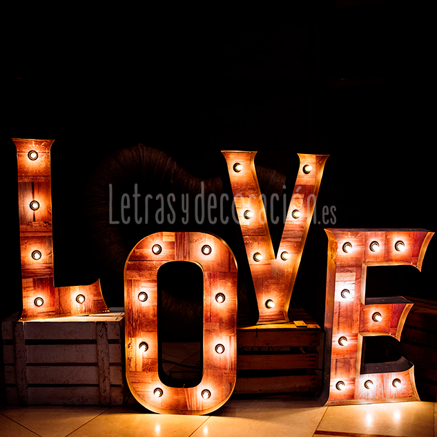 Letras de metal y madera, iluminadas con bombillas de luz cálida, todas ellas llevan circuito eléctrico oculto.
